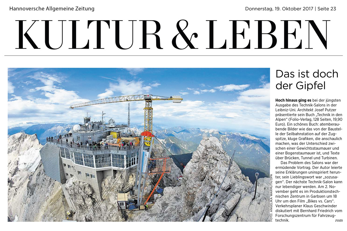 Die Alpen galten lange als eine unzugängliche Gegend und als geologisches Hinderniss. Für die technische Fantasie wurden sie dadurch zur Herausforderung. Davon berichten Josef Putzer & Co. in ihrem Sachbuch »Technik in den Alpen«. In zwölf Kapiteln schildern die Autoren, wie Ingenieure und Baumeister die Alpen mittels Technik erschlossen und zivilisiert haben und wie sich die Alpen dadurch verändert haben.