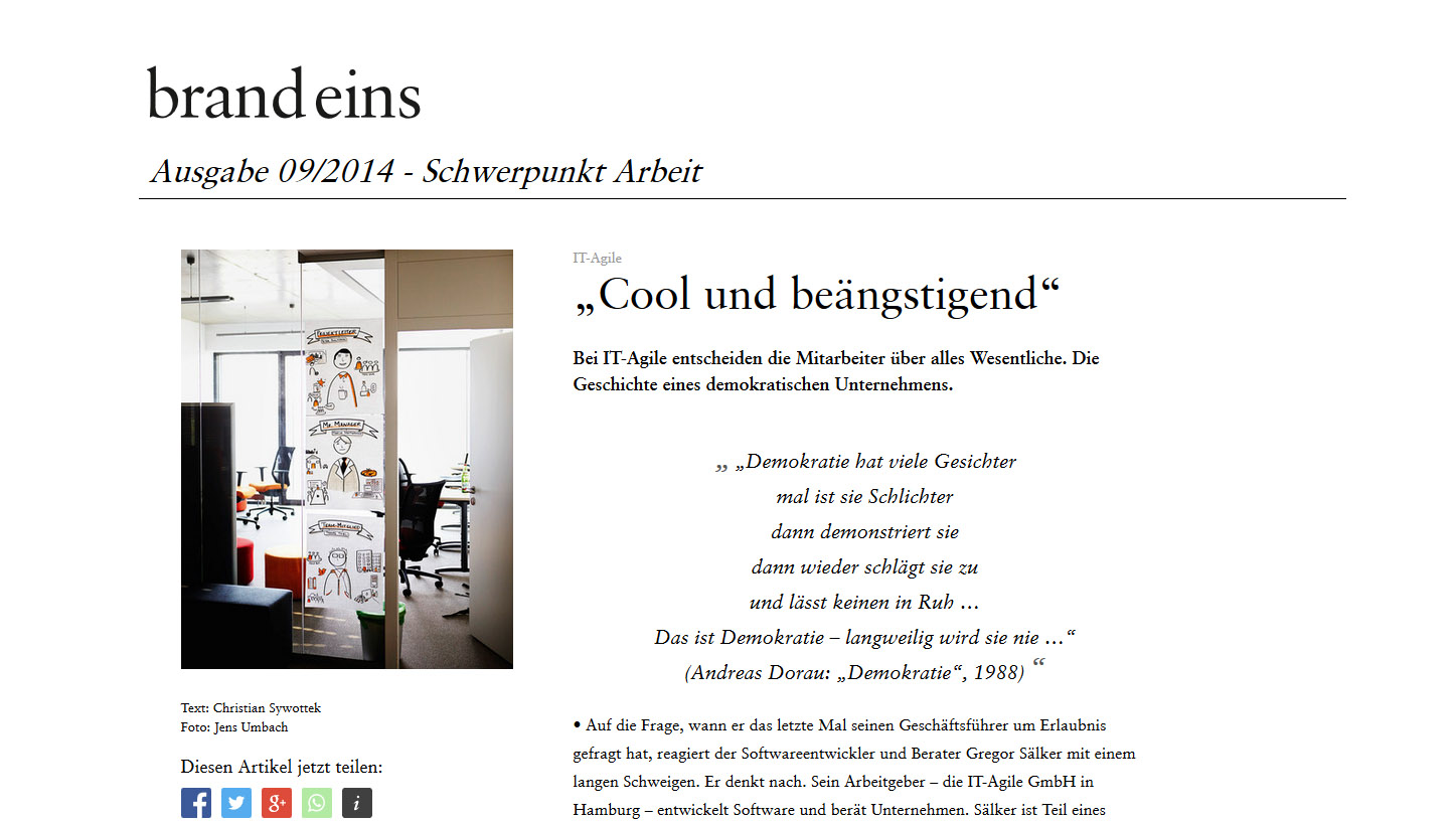 Für die Softwareentwicklung ist »agil sein« das Gebot der Stunde. Dahinter steckt ein ganzes Set von Prinzipien und Methoden. Und es gibt Vorreiter wie Stefan Roock, der mit IT-Agile in Hamburg ein Unternehmen managt, indem er dafür sorgt, dass es sich selbst organisiert. Wir werden es erleben.