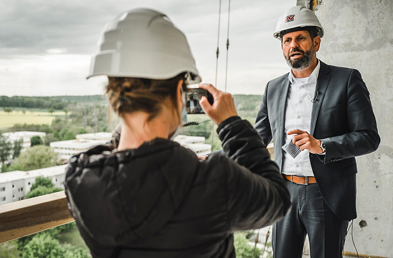 »Wir können nicht nur neu bauen. Wir müssen uns auch sehr genau den Bestand ansehen. Und wir müssen sehen, ob wir nicht sanieren können. (...) Wolfsburg sollte Maßstab sein für viele weitere Projekte in Niedersachsen!« Bauminister Olaf Lies vor Ort im April 2020. Foto © Hans-Dieter Brand